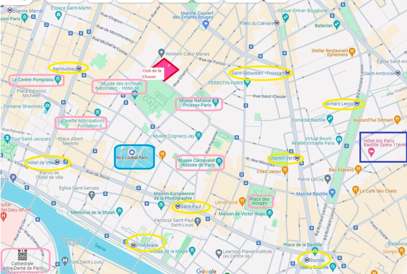 We provide accommodation for our participants at the Ibis Paris Bastille Opéra 11ème, located at 15 rue Breguet, 75011 Paris, a 20-minute walk from the Club de la Chasse, or 21 minutes from the Rice Global Paris Center. All the hotel’s rooms can be used for single or double occupancy (by default, rooms are prepared with a double bed, but two single beds can be requested in advance). There is a small additional charge to the room booking if a second person is added to the room. Breakfast is included but is charged per person. In other words, if a second person is added to the room, this entails an extra charge for breakfast as well.